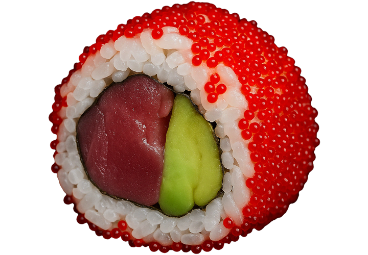 Ролл Калифорния со свежим тихоокеанским Тунцом запомнится тебе не только своей яркостью, благодаря икре Тобико, но и прекрасным рыбным вкусом, который удачно подчеркивают авокадо и огурец. Заказывай!