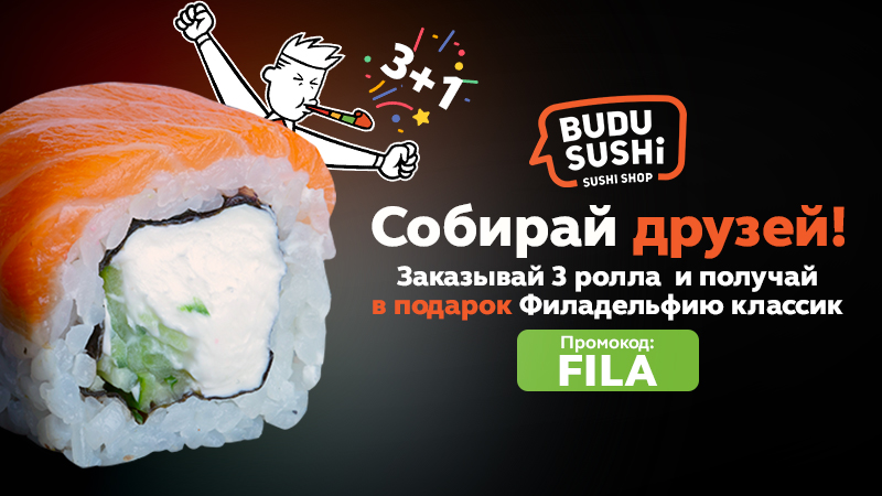 Закажи 3 любых ролла из меню, используй промокод "FILA" в мобильном приложении или назови его кассиру в магазине, получи четвертый ролл Филадельфия Классик в подарок!